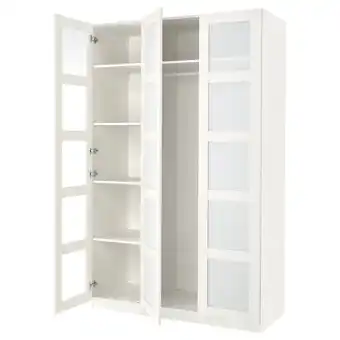 Witte pax kledingkast met glazen deuren en meerdere planken korting bij IKEA