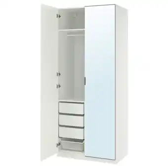 Witte pax kledingkast, open: spiegeldeuren, planken, lades aanbieding bij IKEA – binnenkort verwacht