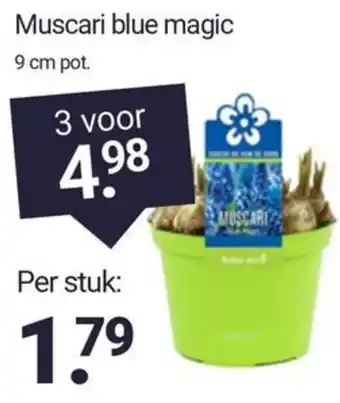 De Muscari blue magic is een prachtige voorjaarsbloeier die in een 9 cm pot wordt geleverd. Met zijn unieke blauwe bloemen voegt hij een vleugje magie toe aan je tuin. Plant deze Muscari in groepen van 3 voor een spectaculair effect. De Muscari blue magic gedijt het beste in goed doorlatende grond en een zonnige tot halfschaduwrijke plek. Deze mooie bloem is verkrijgbaar voor slechts 1.79 per stuk, maar je kunt ook profiteren van de aanbieding van 3 voor 4.98. Voeg wat kleur toe aan je tuin en geniet van de betoverende schoonheid van de Muscari blue magic. Bestel hem vandaag nog en laat je tuin tot leven komen!