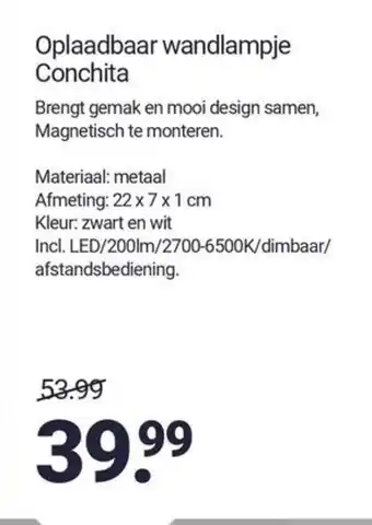 Brengt gemak en mooi design samen, dit oplaadbare wandlampje Conchita is gemaakt van metaal en heeft een afmeting van 22 x 7x1cm. Het lampje is verkrijgbaar in de kleuren zwart en wit en wordt geleverd inclusief LED verlichting (200lm, 2700-6500K, dimbaar) en afstandsbediening. Het lampje is magnetisch te monteren, waardoor het eenvoudig te bevestigen is op verschillende oppervlakken. Met een prijs van 39.99 is dit lampje een betaalbare en praktische toevoeging aan elk interieur. Of je nu extra verlichting nodig hebt in de slaapkamer, woonkamer of kantoor, de oplaadbare wandlamp Conchita zorgt voor sfeer en functionaliteit in elke ruimte.