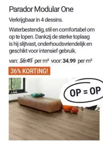 Parador Modular One is een waterbestendige laminaatvloer verkrijgbaar in 4 dessins. Deze vloer is stil en comfortabel om op te lopen, dankzij de sterke toplaag die slijtvast is. Hierdoor is hij onderhoudsvriendelijk en geschikt voor intensief gebruik. Normaal kost deze vloer 55,49 per m², maar nu is hij afgeprijsd naar 34,99 per m² met maar liefst 36% korting! Wees er snel bij, want OP=OP. Met Parador Modular One haal je een duurzame en stijlvolle vloer in huis die jarenlang meegaat. Profiteer nu van deze aanbieding en geef je interieur een upgrade met deze hoogwaardige laminaatvloer.