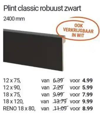 De Plint classic robuust zwart is een stijlvolle en duurzame plint die perfect past bij elk interieur. Deze plint is gemaakt van hoogwaardig materiaal en heeft een klassiek design met een robuuste uitstraling. De zwarte kleur zorgt voor een tijdloze look en geeft een mooi contrast met lichte of gekleurde muren. De plint is ook verkrijgbaar in het wit, waardoor je kunt kiezen welke kleur het beste bij jouw stijl past. Profiteer nu van de speciale aanbieding en koop de Plint classic robuust zwart voor slechts €4.99 in plaats van €6.39. Deze plint is 18 x 80 cm groot en eenvoudig te monteren. Upgrade je interieur met deze prachtige plint!