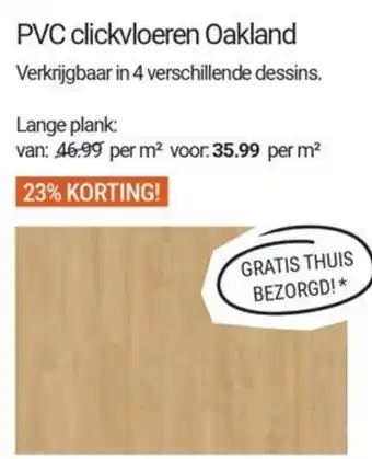 Verfraai je interieur met de PVC clickvloeren Oakland. Deze lange planken zijn verkrijgbaar in 4 verschillende dessins, waardoor er altijd een stijl is die bij jouw smaak past. Profiteer nu van 23% korting en betaal slechts 35.99 per m² in plaats van 46.99 per m². Bovendien wordt jouw bestelling gratis thuis bezorgd*. De PVC clickvloeren Oakland zijn eenvoudig te leggen dankzij het handige kliksysteem. Met deze hoogwaardige vloer haal je niet alleen een prachtige uitstraling in huis, maar ook een duurzame en onderhoudsvriendelijke vloer. Maak van jouw huis een thuis met de PVC clickvloeren Oakland. *Gratis thuisbezorging geldt bij een minimale bestelwaarde.