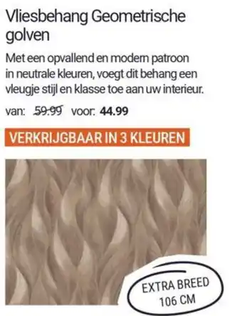 Met een opvallend en modern patroon in neutrale kleuren, voegt dit behang een vleugje stijl en klasse toe aan uw interieur. Dit vliesbehang is verkrijgbaar in 3 kleuren en is extra breed, waardoor het perfect is voor het creëren van een statement muur in elke kamer. De geometrische golven zorgen voor een eigentijdse uitstraling en kunnen gemakkelijk gecombineerd worden met verschillende interieurstijlen. Of u nu kiest voor een subtielere look of juist wilt uitpakken met een gedurfd ontwerp, dit behang biedt eindeloze mogelijkheden. En met de huidige korting van 25%, is het nu het perfecte moment om uw interieur een upgrade te geven met dit prachtige vliesbehang.