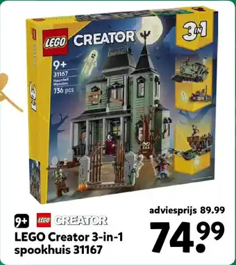 Laat je fantasie de vrije loop met de LEGO Creator 3-in-1 spookhuis 31167 set! Bouw een angstaanjagend Haunted Mansion met 736 stuks en beleef uren speelplezier. Deze set is geschikt voor kinderen vanaf 9 jaar en ouder en stimuleert creativiteit en bouwvaardigheden. Met de LEGO Creator 3-in-1 spookhuis 31167 kunnen kinderen niet alleen het spookhuis bouwen, maar ook twee andere griezelige modellen creëren. De adviesprijs van deze set is 89.99, maar bij ons is hij verkrijgbaar voor slechts 74.99. Een geweldig cadeau voor LEGO fans en liefhebbers van spookhuizen. Bestel nu en laat het bouwplezier beginnen!