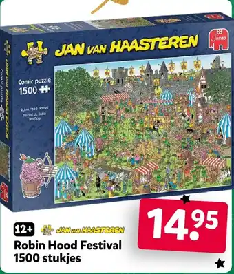 Breng het Robin Hood Festival tot leven met deze prachtige puzzel van 1500 stukjes. Het Robin Hood Festival, geïnspireerd op de legendarische held Robin Hood, is een kleurrijk en levendig evenement dat jong en oud zal aanspreken. De puzzel bevat afbeeldingen van het festivalterrein, kraampjes met heerlijk eten en drinken, en natuurlijk Robin Hood zelf die zijn pijlen schiet. De illustraties zijn gemaakt in de herkenbare stijl van JAN VAN HAASTEREN en zorgen voor uren puzzelplezier. Deze puzzel is geschikt voor puzzelaars van 12 jaar en ouder en is een geweldige toevoeging aan elke puzzelcollectie. Haal het Robin Hood Festival in huis en geniet van het samenstellen van deze unieke en uitdagende puzzel!