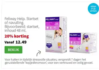 De prijs van de Feliway Help. Startset of navulling. Bijvoorbeeld: startset, inhoud 48 ml. kan ook teruggevonden worden hierboven op de pagina, samen met de datum van wanneer de aanbieding beschikbaar is. Ook kun je de prijzen in de huidige Intratuin folder of op de Intratuin website controleren. De aanbiedingen verzekeren je van het kopen van de Intratuin producten voor de laagste prijs.