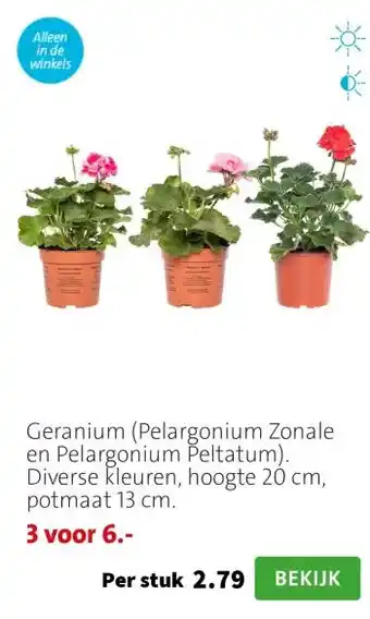 De Geranium (Pelargonium Zonale en Pelargonium Peltatum). Diverse kleuren, hoogte 20 cm, potmaat 13 cm. is momenteel met korting verkrijgbaar bij Intratuin. Hier vind je alle details over prijs, geldigheidsduur en actievoorwaarden. Vergeet niet om ook andere aanbiedingen en deals voor Geranium (Pelargonium Zonale en Pelargonium Peltatum). Diverse kleuren, hoogte 20 cm, potmaat 13 cm. te bekijken zodat je zeker weet dat je de beste prijs betaalt. De kortingsactie loopt van 27-04-2026 tot 03-05-2026. Is de actie inmiddels verlopen? Geen zorgen, vergelijk dan soortgelijke aanbiedingen of volg de productcategorie voor toekomstige prijsverlagingen. Zo koop je altijd met voordeel.Veelgestelde vragen over Geranium (Pelargonium Zonale en Pelargonium Peltatum). Diverse kleuren, hoogte 20 cm, potmaat 13 cm.