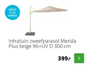 De prijs van de Intratuin zweefparasol Merida Plus beige 96+UV D 300 cm kan ook teruggevonden worden hierboven op de pagina, samen met de datum van wanneer de aanbieding beschikbaar is. Ook kun je de prijzen in de huidige Intratuin folder of op de Intratuin website controleren. De aanbiedingen verzekeren je van het kopen van de Intratuin producten voor de laagste prijs.