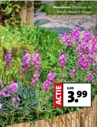 De aanbieding is verkrijgbaar in verschillende winkels, bekijk alle producten om de goedkoopste Muurbloem te krijgen. Als je graag wilt kijken of het artikel met meer korting te koop is in een andere winkel, bekijk de categorie 'Tuin en Dier'. Wellicht vind je deze aanbiedingen ook interessant: Muurbloem (Erysimum 'Bowles Mauve') D 11 H 15 cm, Intratuin bloemenzaad muurbloem (cheiranthus cheirri 'fair lady') & aanbieding 3.