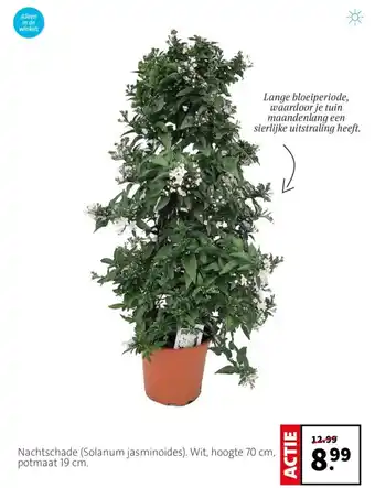 De Nachtschade (Solanum jasminoides) is een prachtige plant met witte bloemen en een hoogte van 70 cm. Deze plant heeft een lange bloeiperiode, waardoor je tuin maandenlang een sierlijke uitstraling heeft. Nu tijdelijk in de aanbieding voor slechts €8.99 in plaats van €12.99. Haal deze mooie plant nu in huis en geniet van zijn elegante uitstraling. De potmaat is 19 cm, waardoor de plant meteen een volwassen uitstraling heeft. Je kunt de Nachtschade Solanum Jasminoides zowel binnen als buiten plaatsen. Mis deze kans niet en haal deze prachtige plant vandaag nog in huis. Deze aanbieding is alleen geldig in de winkels, dus wees er snel bij!