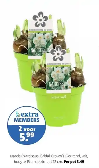 De prijs van de Narcis (Narcissus 'Bridal Crown') kan ook teruggevonden worden hierboven op de pagina, samen met de datum van wanneer de aanbieding beschikbaar is. Ook kun je de prijzen in de huidige Intratuin folder of op de Intratuin website controleren. De aanbiedingen verzekeren je van het kopen van de Intratuin producten voor de laagste prijs.