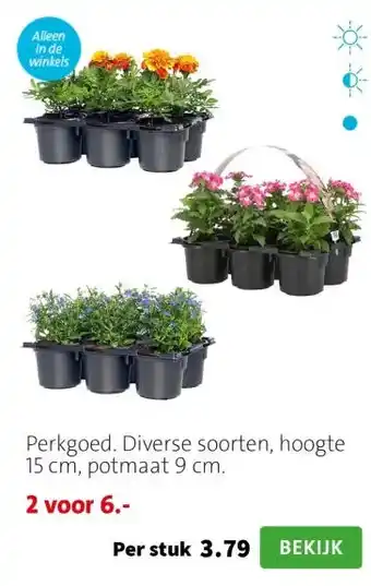 Nu in de aanbieding bij Intratuin: Perkgoed. Diverse soorten, hoogte 15 cm, potmaat 9 cm.✅ Actie geldig van 20-04 t/m 26-04.