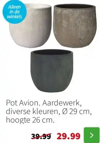 De prijs van de Pot Avion. Aardewerk kan ook teruggevonden worden hierboven op de pagina, samen met de datum van wanneer de aanbieding beschikbaar is. Ook kun je de prijzen in de huidige Intratuin folder of op de Intratuin website controleren. De aanbiedingen verzekeren je van het kopen van de Intratuin producten voor de laagste prijs.