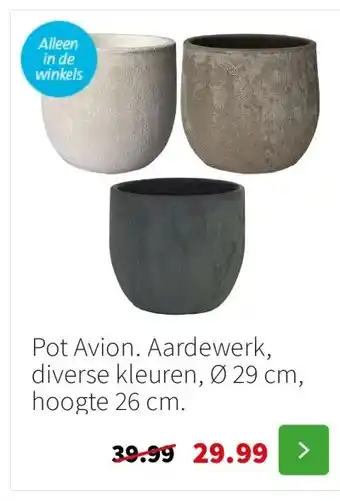 Nu in de aanbieding bij Intratuin: Pot Avion. Aardewerk, diverse kleuren, Ø 29 cm, hoogte 26 cm.✅ Actie geldig van 5-01 t/m 11-01.