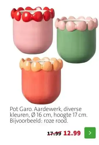 Nu in de aanbieding bij Intratuin: Pot Garo. Aardewerk, diverse kleuren, Ø 16 cm, hoogte 17 cm. Bijvoorbeeld: roze rood.✅ Actie geldig van 9-02 t/m 15-02.