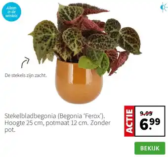 Intratuin biedt naast de Stekelbladbegonia een ruime collectie producten aan. Houd de wekelijkse Intratuin folder in de gaten om de beste aanbiedingen en acties te vinden. Naast Stekelbladbegonia, kunt u ook de volgende aanbiedingen vinden: Stekelbladbegonia (Begonia ‘Ferox’). Hoogte 25 cm, potmaat 12 cm. Zonder pot., aanbieding 2 & aanbieding 3.