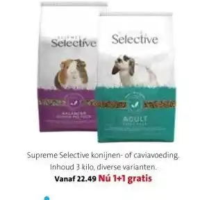 De prijs van de Supreme Selective konijnen- of caviavoeding. kan ook teruggevonden worden hierboven op de pagina, samen met de datum van wanneer de aanbieding beschikbaar is. Ook kun je de prijzen in de huidige Intratuin folder of op de Intratuin website controleren. De aanbiedingen verzekeren je van het kopen van de Intratuin producten voor de laagste prijs.