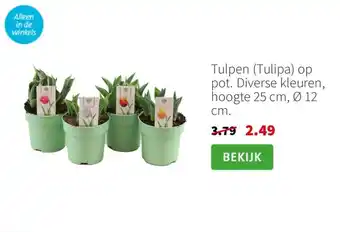 De aanbieding is verkrijgbaar in verschillende winkels, bekijk alle producten om de goedkoopste Tulpen (Tulipa) op pot te krijgen. Als je graag wilt kijken of het artikel met meer korting te koop is in een andere winkel, bekijk de categorie 'Tuin en Dier'. Wellicht vind je deze aanbiedingen ook interessant: Tulpen (Tulipa) op pot. Diverse kleuren, hoogte 25 cm, Ø 12 cm., Tulpen in pot & Tulpen.