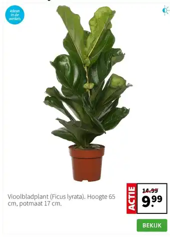 De prijs van de Vioolbladplant (Ficus lyrata). Hoogte 65 cm, potmaat 17 cm. kan ook teruggevonden worden hierboven op de pagina, samen met de datum van wanneer de aanbieding beschikbaar is. Ook kun je de prijzen in de huidige Intratuin folder of op de Intratuin website controleren. De aanbiedingen verzekeren je van het kopen van de Intratuin producten voor de laagste prijs.