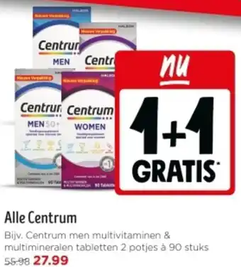 Ontvang nu alle Centrum multivitaminen & multimineralen tabletten met de 1+1 GRATIS actie! Profiteer van deze geweldige aanbieding en vul je voorraad aan met hoogwaardige supplementen. Of je nu op zoek bent naar Centrum, MEN 50+, WOMEN of HALBON, er is voor ieder wat wils. Met Alle Centrum ben je verzekerd van alle essentiële voedingsstoffen die je lichaam nodig heeft. De tabletten zijn makkelijk in te nemen en bevatten een uitgebalanceerde mix van vitaminen en mineralen. Bestel nu en geniet van de voordelen van een gezonde levensstijl met Centrum. Mis deze kans niet en profiteer van de GRATIS PRODUCTEN bij aankoop van Alle Centrum multivitaminen & multimineralen tabletten!