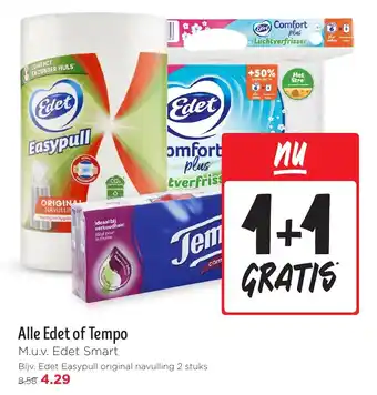 Jumbo biedt naast de Alle Edet of Tempo een ruime collectie producten aan. Houd de wekelijkse Jumbo folder in de gaten om de beste aanbiedingen en acties te vinden. Naast Alle Edet of Tempo, kunt u ook de volgende aanbiedingen vinden: Edet of tempo, Tempo en Edet & Demak'Up, Edet en Tempo.