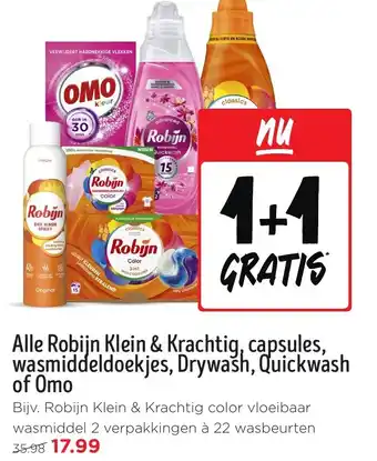 Alle Robijn Klein & Krachtig, capsules, wasmiddeldoekjes, Drywash, Quickwash of Omo 1+1 GRATIS
