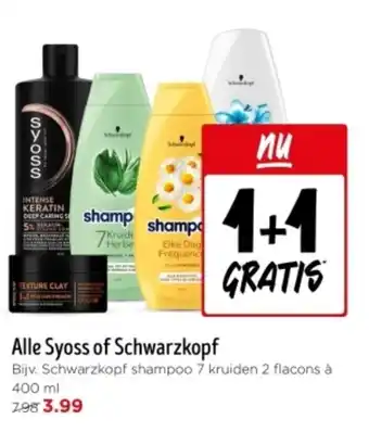 Profiteer nu van de actie waarbij je bij aankoop van Alle Syoss of Schwarzkopf producten, de tweede gratis krijgt! Kies uit verschillende varianten zoals Schwarzkopf shampoo 7 kruiden, Syoss INTENSE KERATIN DEEP CARINGS KERADI, of Schwarzkopf TEXTURE CLAY. Verzorg je haar met de beste producten voor een voordelige prijs. Of je nu op zoek bent naar een shampoo voor elke dag, een herstellende conditioner of een styling product, met Alle Syoss of Schwarzkopf zit je altijd goed. Mis deze kans niet en sla snel je voorraad in. Deze aanbieding geldt zolang de voorraad strekt, dus wacht niet te lang met bestellen. Bestel nu en geniet van prachtig verzorgd haar!