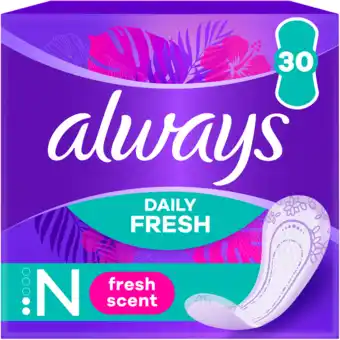 Nu in de aanbieding bij Jumbo: Always Daily Fresh Normal Met Een Frisse Geur✅ Actie geldig van 4-03 t/m 10-03.