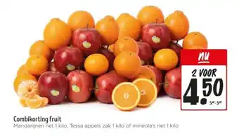 Profiteer nu van de combikorting op verschillende soorten fruit! Kies uit mandarijnen net 1 kilo, Tessa appels zak 1 kilo of mineola's net 1 kilo en betaal slechts 4.50 voor 2 stuks. Geniet van de sappige mandarijnen, zoete Tessa appels of verfrissende mineola's. Deze aanbieding is perfect voor de fruitliefhebbers die graag variëren en voordelig uit willen zijn. Of je nu op zoek bent naar een gezonde snack voor onderweg of ingrediënten voor een smaakvol dessert, met de combikorting fruit zit je altijd goed. Haal snel jouw favoriete combinatie in huis en geniet van de heerlijke smaken van vers fruit!