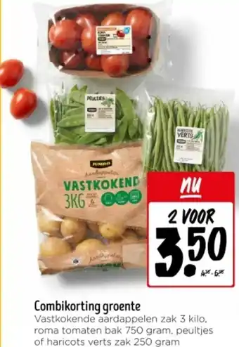 Vastkokende aardappelen zak 3 kilo, roma tomaten bak 750 gram, peultjes of haricots verts zak 250 gram