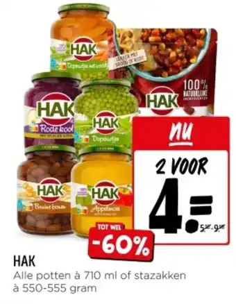 Geniet nu van de heerlijke en natuurlijke producten van HAK met een korting van maar liefst 60%! Alle potten à 710 ml of stazakken van 550-555 gram zijn nu verkrijgbaar in deze geweldige actie. Vul je voorraadkast met de lekkerste groenten en fruit van HAK, perfect om te combineren met brood of rust. Met HAK ben je verzekerd van 100% natuurlijke ingrediënten en de beste kwaliteit. Profiteer nu van deze aanbieding en haal jouw favoriete HAK producten in huis. Mis het niet en sla snel je slag, want deze actie is geldig zolang de voorraad strekt. HAK, tot wel 60% korting op alle potten en stazakken van HAK!