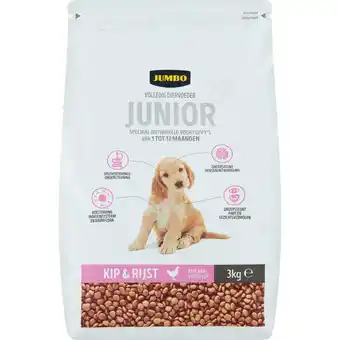 Koop Jumbo Hondenbrokken Junior Kip & Rijst 3kg komende week met korting