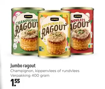 Jumbo biedt naast de Jumbo ragout een ruime collectie producten aan. Houd de wekelijkse Jumbo folder in de gaten om de beste aanbiedingen en acties te vinden. Naast Jumbo ragout, kunt u ook de volgende aanbiedingen vinden: Jumbo ragout, Ragout & Luxe ragout.