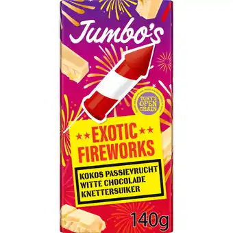 Jumbo's Witte Chocolade Exotic Fireworks Kokos, Passievrucht & Knettersuiker 140 g aanbieding bij Jumbo