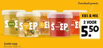 Jumbo biedt naast de Jumbo Soep een ruime collectie producten aan. Houd de wekelijkse Jumbo folder in de gaten om de beste aanbiedingen en acties te vinden. Naast Jumbo Soep, kunt u ook de volgende aanbiedingen vinden: Unox soep, Unox soep in zak & Jumbo's Verse Soep Bospaddenstoel Truffelsmaak 500 g.