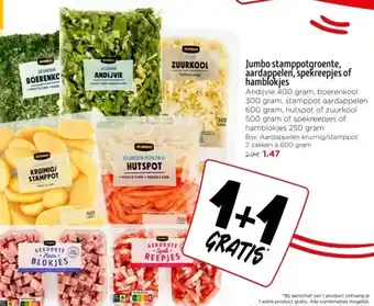 Jumbo stamppotgroente, aardappelen, spekreepjes of hamblokjes 250/ 600 g 1+1 gratis