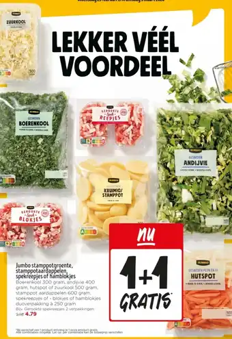 Jumbo stamppotgroente, stamppotaardappelen, spekreepjes of hamblokjes 1+1 gratis
