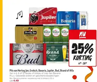 Koop Pils van Hertog Jan, Grolsch, Bavaria, Jupiler, Bud, Brand of Alfa Set à 4, 6 of 12 flesjes of blikjes of tray van Bavaria komende week met korting