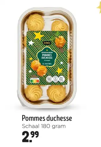 De prijs van de Pommes duchesse kan ook teruggevonden worden hierboven op de pagina, samen met de datum van wanneer de aanbieding beschikbaar is. Ook kun je de prijzen in de huidige Jumbo folder of op de Jumbo website controleren. De aanbiedingen verzekeren je van het kopen van de Jumbo producten voor de laagste prijs.