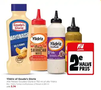 Geniet nu van alle flessen Gouda's Glorie à 750 ml of alle Yildriz sauzen voor de halve prijs! Kies uit heerlijke opties zoals Yildriz Turkse knoflooksaus of Gouda's Glorie Thaise Sriracha mayo. Deze vol & romige sauzen zijn al sinds 1924 een favoriet in vele keukens. Probeer de pittige chili mayo voor een kick of de smaakvolle knoflooksaus voor een Turkse twist. Met 750 ml per fles heb je genoeg om van te genieten tijdens vele maaltijden. Mis deze aanbieding niet en haal jouw favoriete Yildriz of Gouda's Glorie sauzen nu in huis!