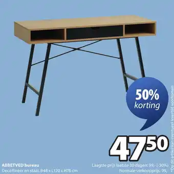 Profiteer nu van maar liefst 50% korting op het stijlvolle ABBETVED bureau, gemaakt van hoogwaardig Deco fineer en staal. Met afmetingen van B48 x L120 x H76 cm is dit bureau perfect voor elke werkplek of studeerkamer. De normale verkoopprijs van dit bureau is 99,-, maar nu tijdelijk verkrijgbaar voor slechts 47.50. De laagste prijs van de afgelopen 30 dagen was 99,-, dus dit is een geweldige deal die je niet wilt missen. Let op: op dit artikel kan eventueel levertijd voorkomen, dus wees er snel bij om jouw ABBETVED bureau met korting te bemachtigen. Creëer een inspirerende en functionele werkplek met dit prachtige bureau!