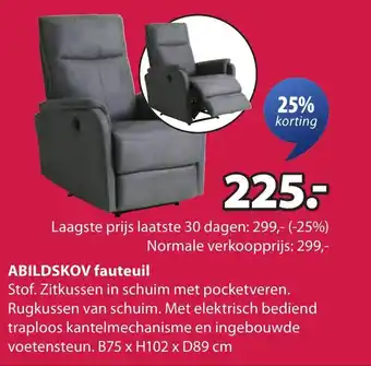 De prijs van de Abildskov fauteuil kan ook teruggevonden worden hierboven op de pagina, samen met de datum van wanneer de aanbieding beschikbaar is. Ook kun je de prijzen in de huidige Jysk folder of op de Jysk website controleren. De aanbiedingen verzekeren je van het kopen van de Jysk producten voor de laagste prijs.