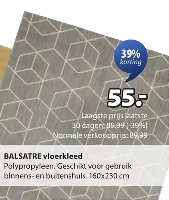 De prijs van de Balsatre vloerkleed kan ook teruggevonden worden hierboven op de pagina, samen met de datum van wanneer de aanbieding beschikbaar is. Ook kun je de prijzen in de huidige Jysk folder of op de Jysk website controleren. De aanbiedingen verzekeren je van het kopen van de Jysk producten voor de laagste prijs.