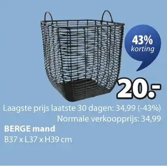 De prijs van de Berge mand kan ook teruggevonden worden hierboven op de pagina, samen met de datum van wanneer de aanbieding beschikbaar is. Ook kun je de prijzen in de huidige Jysk folder of op de Jysk website controleren. De aanbiedingen verzekeren je van het kopen van de Jysk producten voor de laagste prijs.