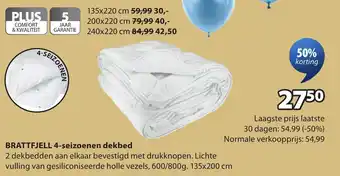 De prijs van de Brattfjell 4-seizoenen dekbed kan ook teruggevonden worden hierboven op de pagina, samen met de datum van wanneer de aanbieding beschikbaar is. Ook kun je de prijzen in de huidige Jysk folder of op de Jysk website controleren. De aanbiedingen verzekeren je van het kopen van de Jysk producten voor de laagste prijs.