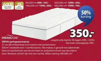 De prijs van de Driva springveermatras kan ook teruggevonden worden hierboven op de pagina, samen met de datum van wanneer de aanbieding beschikbaar is. Ook kun je de prijzen in de huidige Jysk folder of op de Jysk website controleren. De aanbiedingen verzekeren je van het kopen van de Jysk producten voor de laagste prijs.