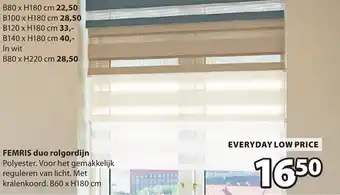 De prijs van de Femris duo rolgordijn kan ook teruggevonden worden hierboven op de pagina, samen met de datum van wanneer de aanbieding beschikbaar is. Ook kun je de prijzen in de huidige Jysk folder of op de Jysk website controleren. De aanbiedingen verzekeren je van het kopen van de Jysk producten voor de laagste prijs.