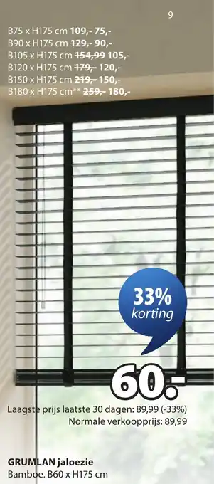 Profiteer nu van 33% korting op de GRUMLAN jaloezie van bamboe. Met een afmeting van B60 x H175 cm past deze jaloezie perfect in elk interieur. De normale verkoopprijs van 89,99 is nu slechts 60.-. Dit is de laagste prijs van de laatste 30 dagen, dus mis deze aanbieding niet! De jaloezie is van hoge kwaliteit en zorgt voor een natuurlijke uitstraling in je woning. Dankzij het bamboe materiaal is de jaloezie ook nog eens duurzaam en milieuvriendelijk. Creëer eenvoudig de gewenste sfeer in je huis met deze prachtige jaloezie. Bestel snel en geniet van de mooie uitstraling en de flinke korting!