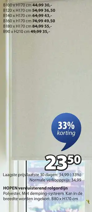 De prijs van de Hopen verduisterend rolgordijn kan ook teruggevonden worden hierboven op de pagina, samen met de datum van wanneer de aanbieding beschikbaar is. Ook kun je de prijzen in de huidige Jysk folder of op de Jysk website controleren. De aanbiedingen verzekeren je van het kopen van de Jysk producten voor de laagste prijs.